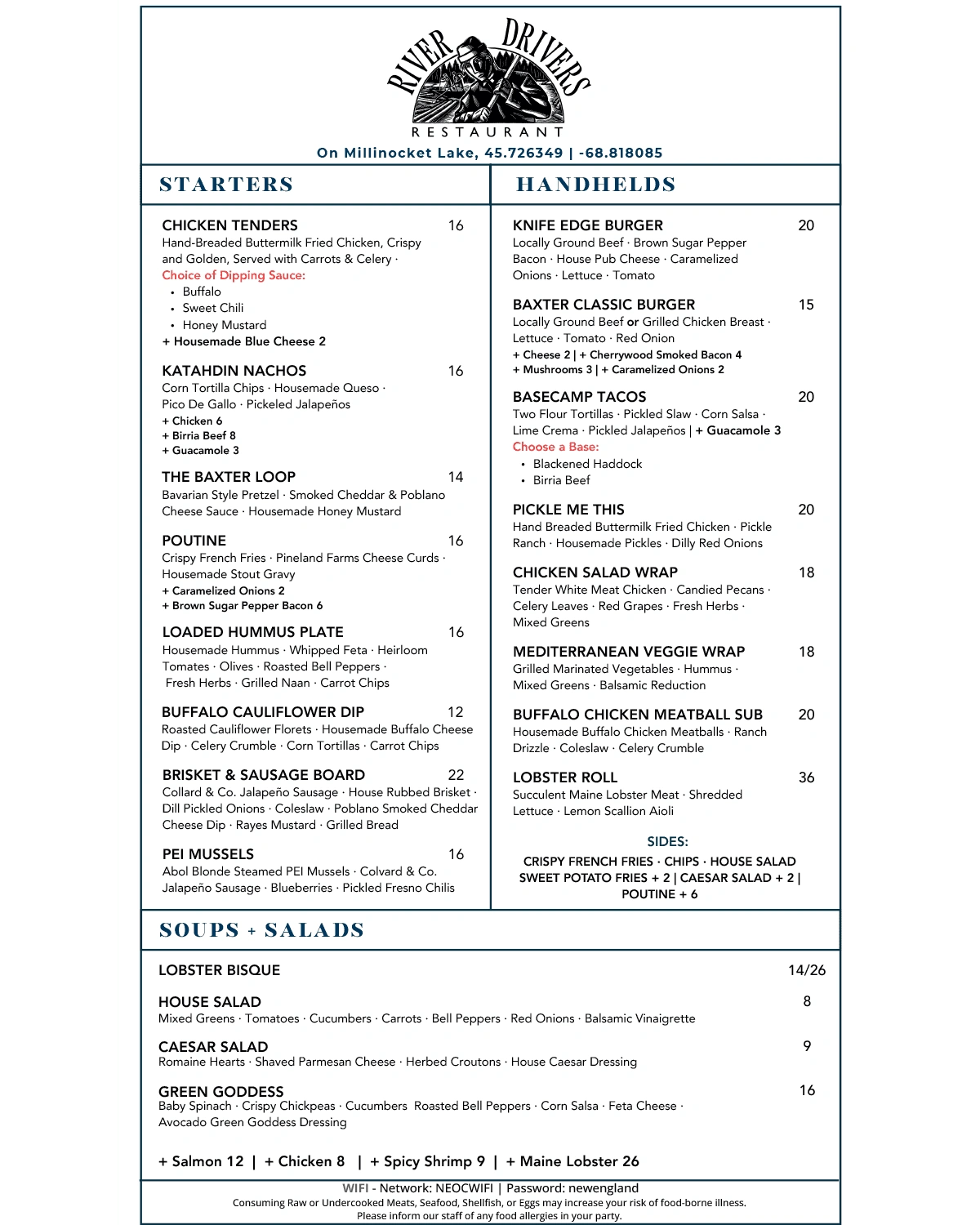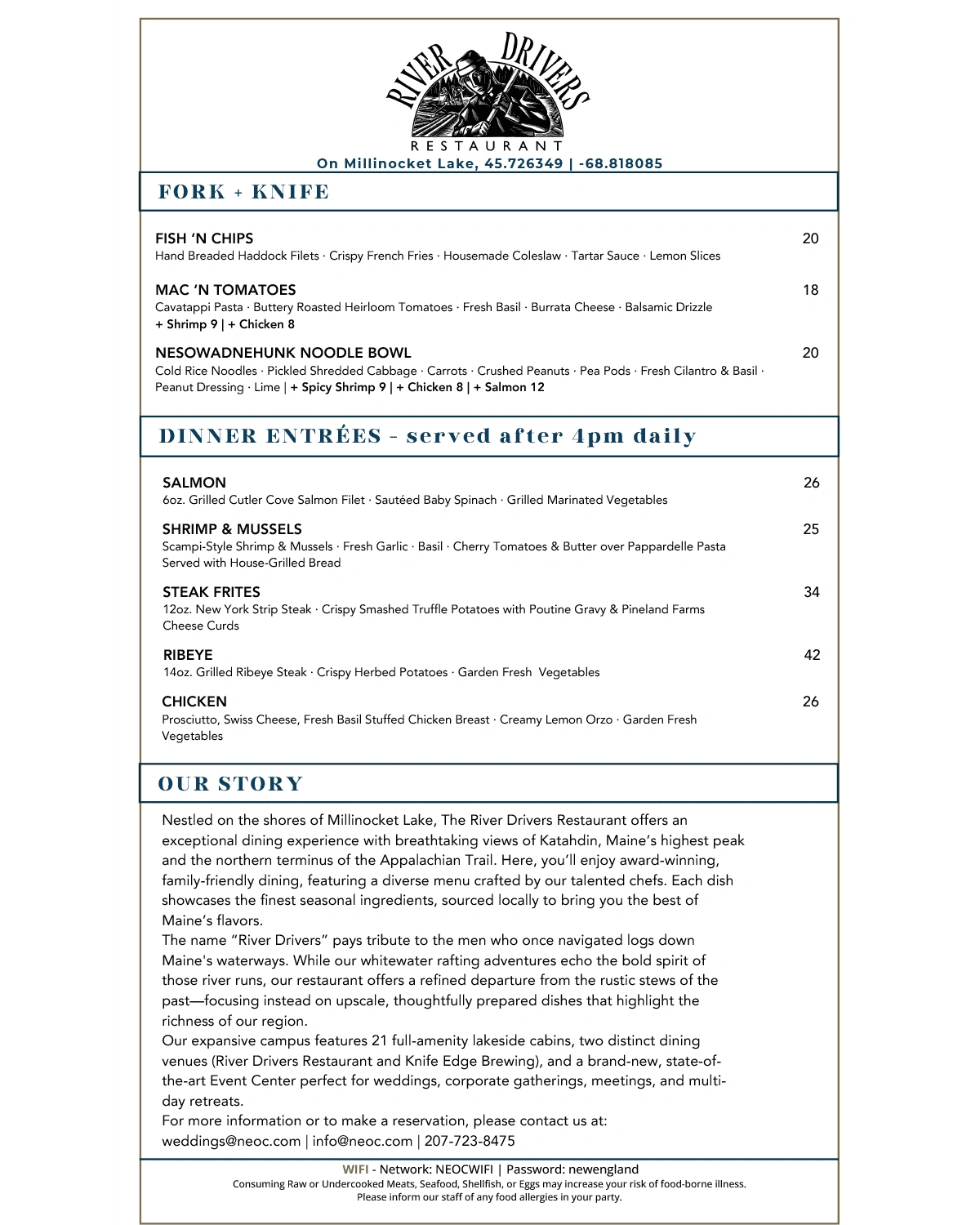 Check in time at New England Outdoor Center begins at 3PM Friday with dinner reservations starting at 5PM. The lodge features 2 restaurants and a brewery which is sure to satisfy any appetite.